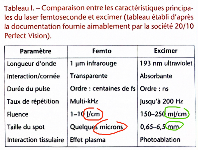The femtosecond laser, by contrast, uses 5–10 micron pulses in a dotted pattern, resulting in less refined tissue removal.